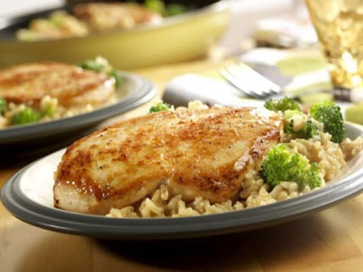 Mix the fist five ingredients together and coat the chicken with the mixture. In a large skillet with a light fitting lid, heat the oil to medium hot. Add chicken and brown on both sides. Add the vegetables and rice stirring to coat with the oil. Add water to skillet and bring to a boil. Reduce to a simmer, cover and cook for 20-25 minutes, until the chicken is fully cooked. Garnish with chopped tomatoes, and sliced green onions of desired.