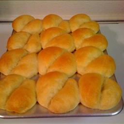 Scald milk; cool to lukewarm (approx. 90 degrees). Dissolve yeast in 1/4 cup lukewarm water. Add to milk. Add sugar, eggs, salt and oil. Add flour. Stir until all is blended. Dough will be sticky. Let rise for about 1 1/2 hours. Shape dough into desired shape. Let rise and bake at 350 degrees until golden brown. (12 to 20 minutes--depending on size) NOTES : I like to make cloverleaf dinner rolls with this dough. Grease muffin tin. Make small walnut size balls by rolling in palms of hands. This dough is sticky; so inorder to handle the dough, flour palms of hand while rolling into balls. Place three balls in each muffin tin. Let rise until doubled. Bake at 350 degrees for 12-15 minutes. Recipe by: Hazel Posted to EAT-L Digest by "Iris E. Dunaway" on Sep 20, 1997