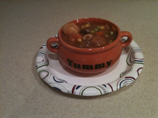 Combine meat, water, broth, salt, and pepper. On low heat, cook about 2 1/2 hours or until meat is tender. Next, add onions and carrots; cook 30 minutes. Add potatoes and cook an additional 30 minutes or until all vegetables are tender. Add macaroni and cook another 10 minutes or until done. Add tomato sauce and spices. Simmer until ready to serve. Serve with corn muffins.