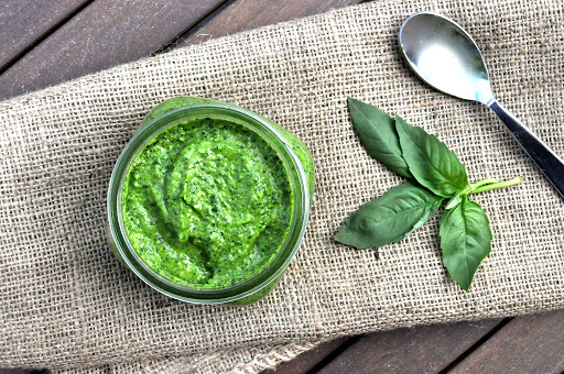 Add basil, lemon juice, roasted garlic, ½ the EVOO, and toasted pine nuts to a food processor. Pulse until it’s evenly combined.