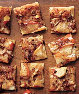Place each sheet of pastry on a parchment-lined baking sheet and prick all over with a fork. Spread with the crème fraîche, leaving a ½-inch border. Top with the onion mixture and bake until the pastry is crisp and browned, 30 to 35 minutes. Cut into pieces before serving.