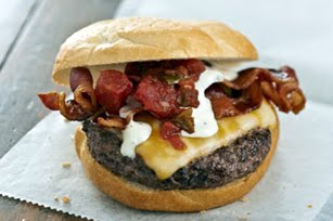 FILL rolls with cheeseburgers; top with bacon, dressing and salsa.