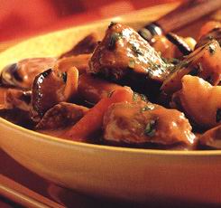 Flour stew beef. Fry beef in oil, with celery and onions. Add v-8 juice. Cook 1 hour at 350 in roasting pan. Add carrots and potatoes cook another hour. Add other veggies. Cook unto veggies are cooked. Use gravy mix, add corn starch if needed.