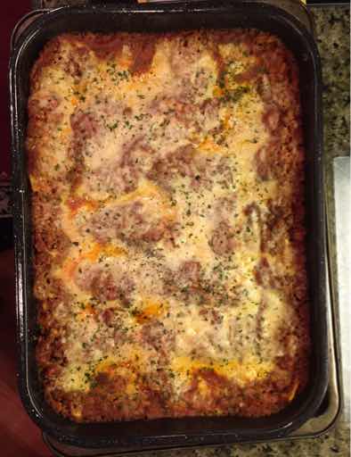 Pour small amount of meat sauce to cover bottom of pan. Then layer with a layer of lasgna noodles, ricotta cheese mixture, sprinkle mozzarella cheese and continue layering with the meat sauce, noodles, cheese mixture and ending with the cheese layer on the top sprinkled with mozzarella cheese.