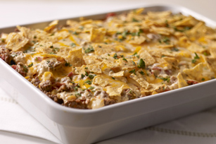 BAKE 30 min. or until heated through. Top with crushed chips and cilantro.