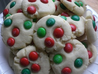 Form into 1-inch balls and place on baking sheets. (Note: if dough is too dry to work with, add milk 1 tablespoon at a time until desired consistency is reached). Gently flatten each cookie using fingers OR a flat-bottomed drinking glass (dipped in sugar to prevent sticking). Press in additional candies to decorate.