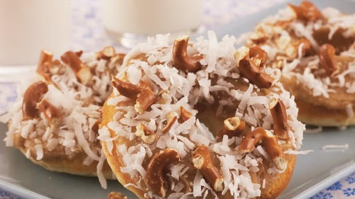 Baked cake-like Bisquick® mix doughnuts glazed with thick caramel sauce and topped with broken pretzel twists and flaked coconut – perfect for your sweet-salty cravings.