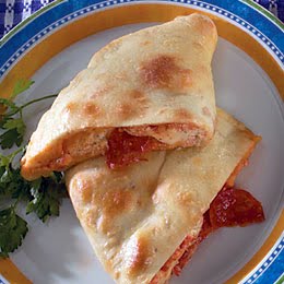 Cut pizza dough in half. Form each into a plate size circle with fingers on a PAM-sprayed counter top. Make sure dough is very thin or calzone will come out too thick and bready.