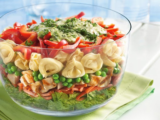 Layered Tortellini Pesto Chicken Salad