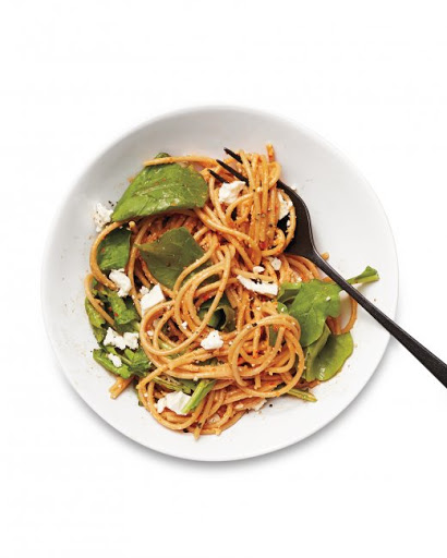 Peppadew Pesto Spaghetti with Feta and Arugula