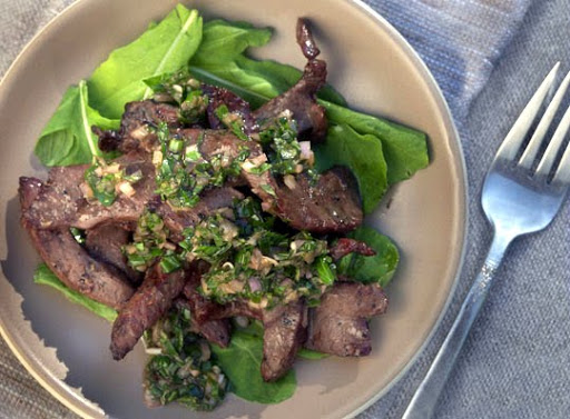 Arrange arugula on plates, top each with beef heart, and spoon the vinaigrette over the meat.