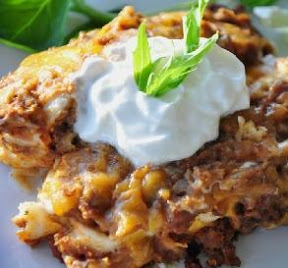 5. Tear up 3 tortillas and spread over sour cream mixture.