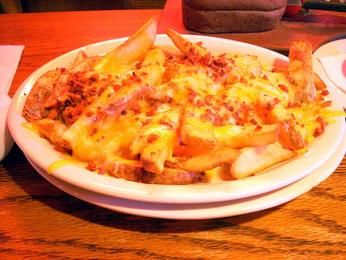 Sprinkle cheese and bacon evenly over fries on the baking sheet. Return fries to hot oven until cheese has melted.