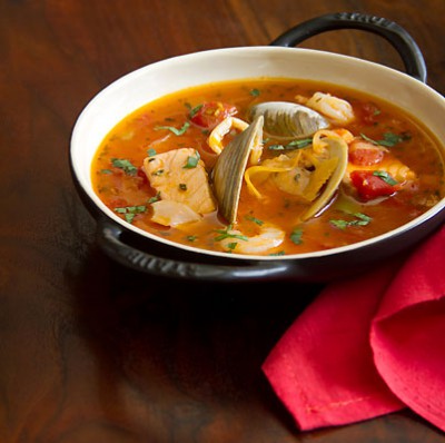 Ladle the cioppino into warm shallow bowls, Garnish with basil. Serve warm.