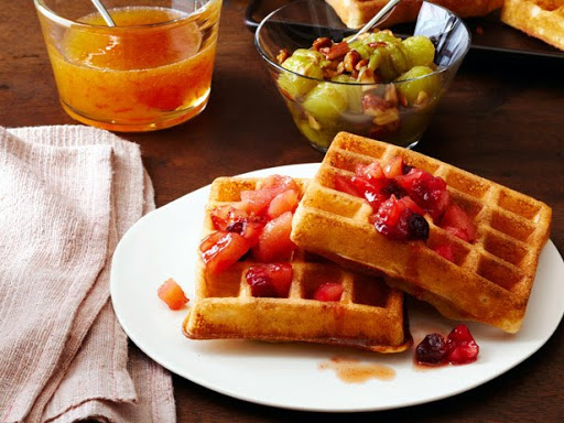 Preheat the oven to 250 degrees F. Preheat a waffle iron; brush with the reserved brown butter. Stir the eggs and baking soda into the batter. Spoon 1/2 to 1/3 cup batter into the waffle iron and cook until golden. Transfer to a baking sheet and keep warm in the oven while you make the rest. Top as desired