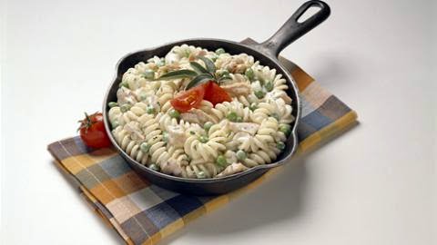 In a large skillet, combine the pasta, peas, tuna, and dressing, and cook over medium heat until heated through.