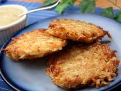 In a food processor, process the potatoes and onions, in batches, until finely chopped. Empty each batch into a strainer and, using a spoon, press down on the mixture to remove as much water as possible.