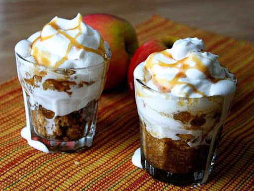 5 To serve, alternately spoon warm apple crisp and cream mixture into small glasses. Top each with caramel topping. Serve immediately.
