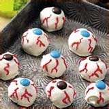 While the chocolate is still wet, press an M&M candy in the center for the iris. Return the eyes to the refrigerator to harden. Once the eyeballs are firm, use a knife to cut the excess chocolate from around the base. Use the red decorator frosting to make squiggly or straight blood vessels.