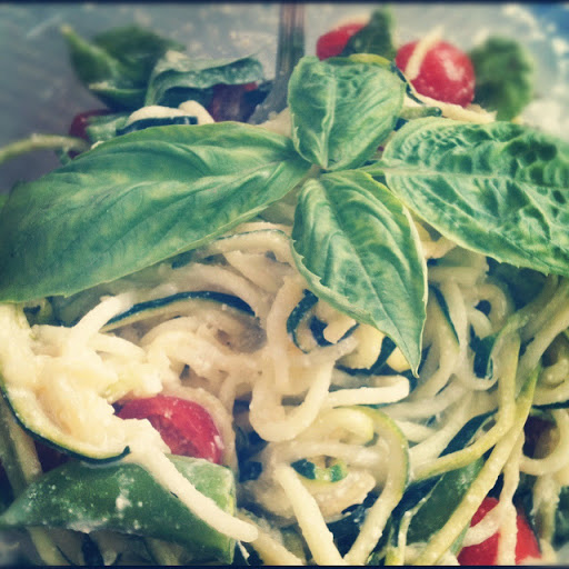 Using a spiralizer on the smallest setting, attach the zucchini and spiralize into noodles. Put the noodles in a colander and sprinkle the sea salt, to mix. Let the water drain and soften the noodles. Place over a bowl to catch the water while you work on the creamy sauce. (Alternatively, you could use a vegetable peeler to create ribbons from the zucchini, which actually create more fettucini-like noodles)