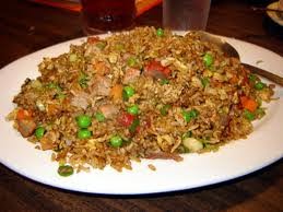Heat the oil in a heavy skillet to the smoking point, add the rice and stir-fry for about 6 minutes. Add the pork and cook for 5 minutes longer, then stir into he soy sauce. Turn up the heat, pour the beaten eggs gradually into the hot mixture stirring vigorously so that the eggs cook and blend in with the rice. Sprinkle in the scallions and serve.