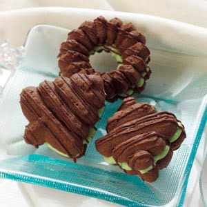 I like how the creamy mint filling peeks through between the layers of these sandwich cookies. A chocolate drizzle on top is a flavorful finishing touch.