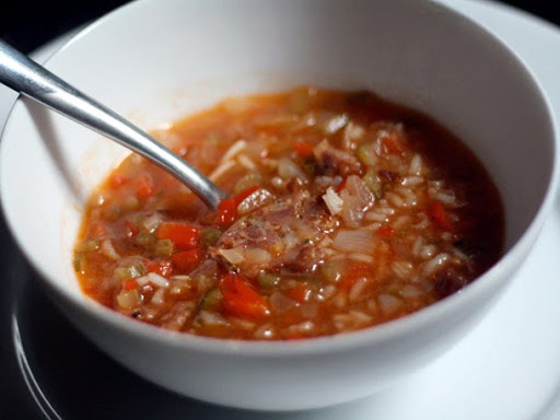 Add the tomatoes, stock, and rice. Bring to a boil over high heat, and then reduce heat to a simmer and cook until rice is plump, about 20 minutes. Turn off the heat, stir in the vinegar, and season to taste with salt and pepper.