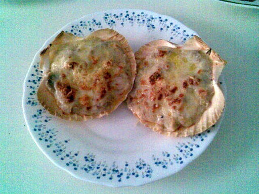 Coloca el relleno de siri en 10 conchas de vieras o de cangrejo pequeño. Coloca encima el queso parmesano rallado y previamente mezclado con la harina, rocía con aceite de oliva.
