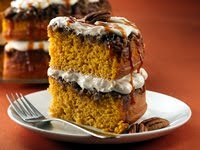 Stir remaining 1/2 teaspoon pumpkin pie spice into frosting. To assemble cake, place 1 layer, praline side up, on serving plate. Spread with half of the frosting. Top with second layer, praline side up; spread remaining frosting to edge of layer. Drizzle with caramel topping and additional pecans. Store loosely covered in refrigerator.