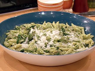 While the pasta is cooking, combine half of the spinach, the nuts, stock, Parmigiano Reggiano, nutmeg, lemon zest and juice, some salt and pepper in the bowl of a food processor. Pulse the machine to chop everything up then stream in about 1/4 cup EVOO (eyeball it) with the machine running. Reserve.