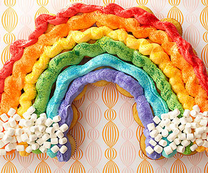 On a very large serving platter arrange cupcakes tightly together in a rainbow shape; use 6 to 8 cupcakes for the inside row, 8 to 10 cupcakes for the middle row, and 12 to 14 cupcakes for the outside row.