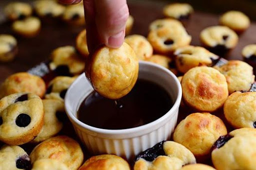 Spray a mini-muffin pan generously with baking spray. Fill cups 2/3 full. If using blueberries, drop 2 to 3 blueberries into each cup.