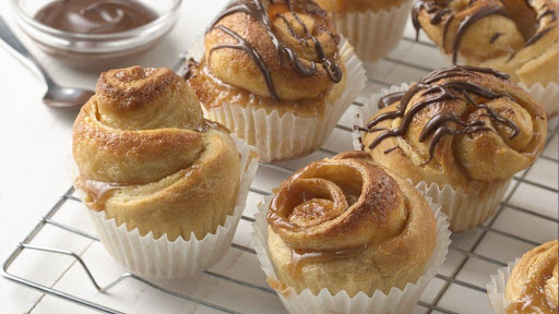 4 Meanwhile, in small microwavable bowl, microwave chocolate hazelnut spread on High 30 to 60 seconds. Drizzle over rolls.