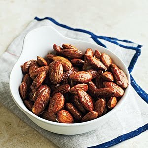 2. Place the almonds in a medium nonstick skillet; cook over medium heat for 6 minutes or until lightly toasted, shaking pan frequently. Combine the remaining ingredients in a 2-cup glass measure. Microwave at HIGH for 30 seconds. Add honey mixture to pan, and cook 2 minutes, stirring constantly. Arrange almond mixture on prepared baking sheet in a single layer; let stand 10 minutes. Break apart any clusters.