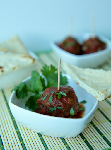 Using spices from Indian cuisine seemed like a good match to the savory, saucy meatballs served in tapas bars — mouthfuls of complex spice and flavor. Something great to have with a cold beverage in a social setting.