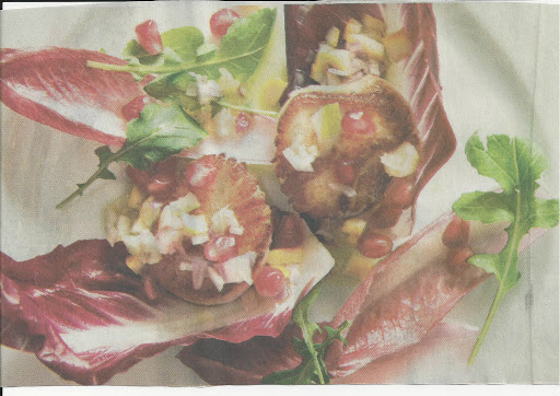 5.Divide radicchio, endive and arugula among 4 large salad plates. Place 2 warm scallops in the center of each plate. Stir vinaigrette vigorously and spoon about a teaspoon on each scallop. Drizzle remaining vinaigrette evenly over each salad. Sprinkle with pomegranate seeds, and serve immediately.