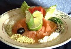 30 minutos antes de consumir el preparado, abrillantamos las láminas finas de salmón con esta mezcla y lo reservamos todo tapado en el frigorífico.