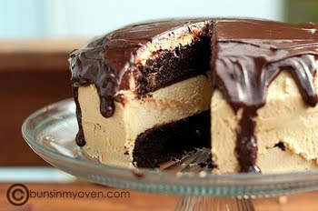 Place one layer of chocolate cake on your cake stand and top with 1/4 of the chocolate peanut butter glaze. Spread to the edges.