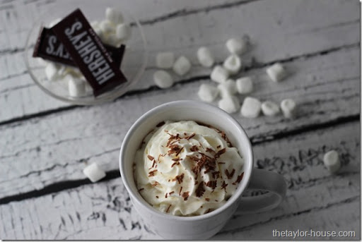 Step 3 – Add the Hot Cocoa to a mug and top with whip cream, marshmallows and chocolate shavings. Enjoy!