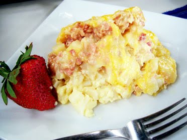 In a bowl, stir together eggs, milk, salt, pepper, hot sauce and dry mustard. Pour over hash browns, bacon and cheese.