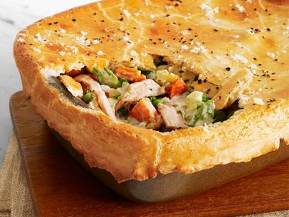 Transfer the filling to a 2-quart casserole dish. Roll out the dough on a lightly floured surface until about 1/2 inch thick and slightly larger than the dish. Beat the reserved egg white in a bowl; brush over the dough and season with salt and pepper. Press the dough against the sides of the dish. Place on a baking sheet and bake until the crust is golden brown, 20 to 25 minutes.