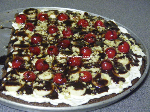 Spread mixture over brownie "crust". Arrange sliced bananas and maraschino cherries (or fresh strawberry slices) over cream cheese layer. Sprinkle with chopped nuts. Drizzle with chocolate ice cream topping or chocolate syrup.