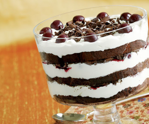 Line the bottom of a 2-1/2- to 3-quart glass bowl or trifle bowl with about a third of the cake slices to create an even layer. Don’t worry if the pieces break, as long as they fill in the spaces. Brush this layer of cake lightly with some of the kirsch syrup, top with a third of the whipped cream, and randomly nestle half of the remaining cherries into the cream. Sprinkle with a third of the chocolate shavings.