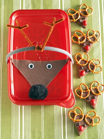 4. For each reindeer, pipe a little frosting on two pretzels; attach to the long side of each cookie for antlers. Use frosting to attach a cherry half to the opposite point for a nose. Pipe two dots of frosting for eyes. Let stand until frosting is set. Layer cookies between waxed paper in gift container; cover.