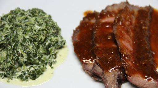 Sliced Steaks with Porcini Sauce and Boursin Creamed Spinach