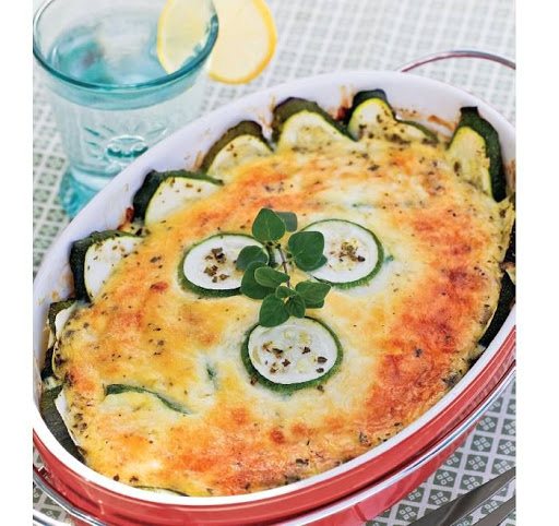 Mix the eggs, heavy cream, salt, pepper, garlic powder, and mozzarella cheese in a bowl, and then pour the mixture over the zucchini in the baking dish.