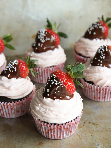 Dip the clean, dry strawberries in the melted chocolate, shake of the excess and gently place each strawberry on the top of one of the cupcakes. Add a few sprinkles to the top of the cupcake and strawberry if desired.