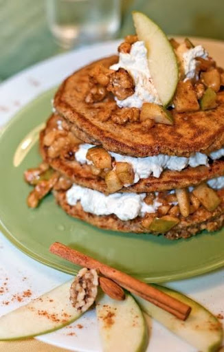 4. Pour 8 medium size cakes onto the hot griddle or pan and let cook on one side for 2 minutes. Before flipping, sprinkle each cake evenly with the filling and let cook for about 2 minutes more until golden brown on the bottom. Then flip the cakes and cook for about 2 minutes more to finish. Serve topped with a pat of butter and garnished with fresh apple slices if desired! Do I dare recommend sugar-free whipped cream? You bet I do!