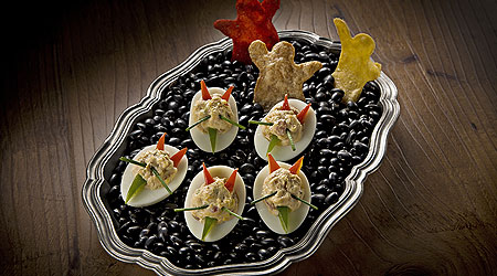 To turn into devils, cut red and green peppers into small triangles to create horns and goatee; stick trimmed chives into sides for mustache.