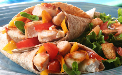 In a nonstick skillet, cook onion, chicken and marinade for 3 minutes or unstil chicken is no longer pink. Add peppers; saute for 3-5 minutes or until crisp-tender. Stir in salsa. Divide mixture among tortillas; top with cheese. Roll up and serve. Yield: 6 servings.